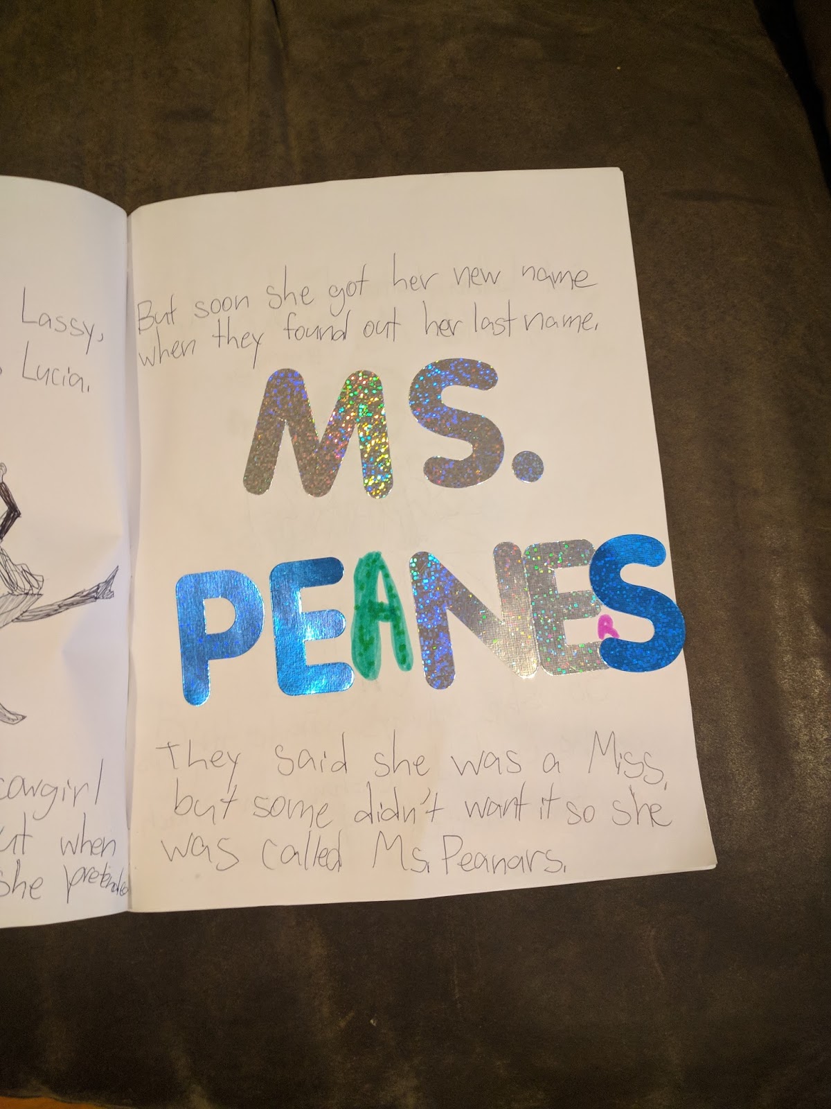 "They all called her Little Lassy, but her real name was Lucia. She was a wonderful cowgirl with a silly personality but when she moved to England she pretended to be a lady. But soon she got her new name when they found out her last name. MS. PEANErS They said she was a Miss, but some didn't want it so she was called Ms. Peanars.